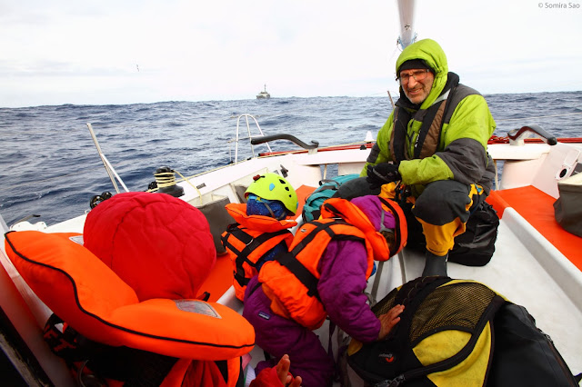 Sibbald, we were easily able to clip them safely into a line and they got lifted up quickly and securely. Pearl was lifted first. I climbed up the ladder second after I told Tormentina and Raivo to be brave, that I would see them in just a few moments. Once I was aboard, I was greeted by smiling crew members, who handed Pearl to me immediately.