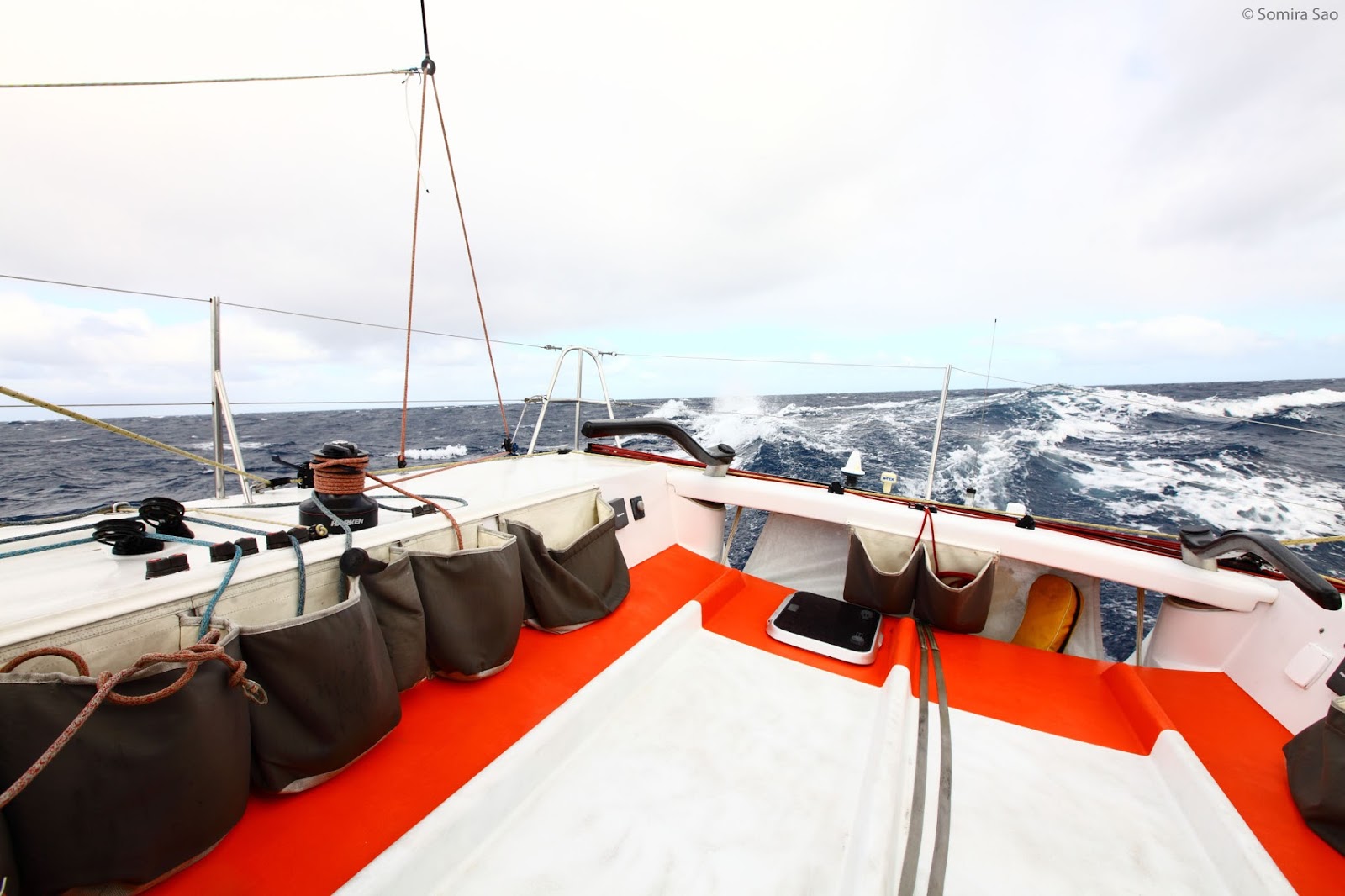 All of our senses grow more acute offshore, especially hearing, as we are always listening for good and bad sounds. Good sounds were his footsteps above us, sails getting dragged to the fore-deck or getting dropped down through the hatch, the winch handle locking in place, the subsequent grinding as the lines are adjusted or tightened, the click of the mast cars working as the main gets reefed or raised, head-sails getting furled or unrolled, and sails getting tightened or eased. Bad sounds were that of a sail or lines slapping loudly, loud bangs, or complete silence. By listening carefully and sensing changes in the boat, sails could be correctly adjusted for best performance.