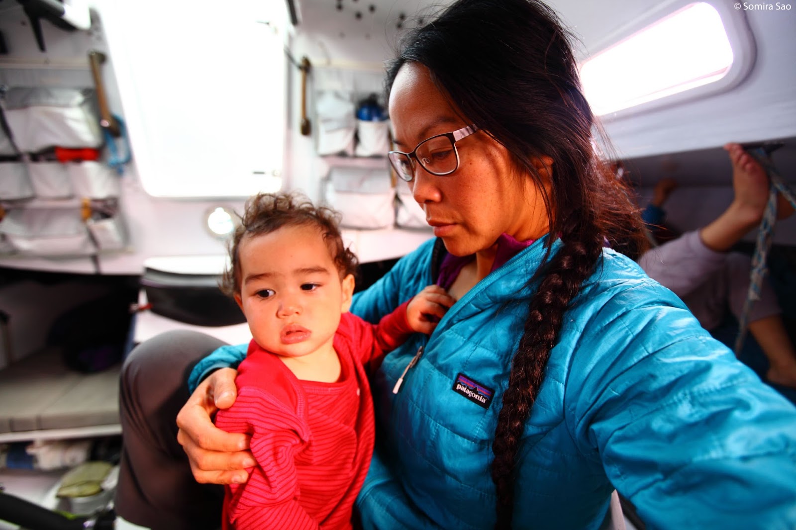 Down below my primary responsibility was keeping the kids safe. All physical movement was always very controlled. Even for our older children to use the head or move about the cabin required direct supervision. My eyes were constantly on them and on the instruments, watching for imminent or unexpected changes in wind speed or direction. If the kids were all asleep and tucked in safely, then James and I could sometimes make a coordinated effort to make a sail change, with me driving the boat down below with the autopilot and him on deck above.